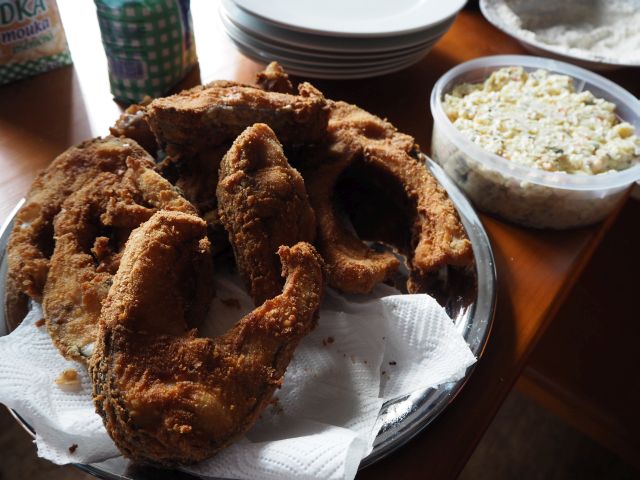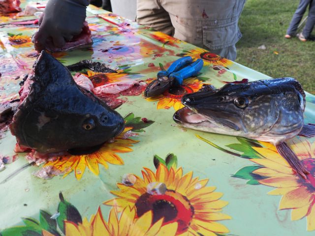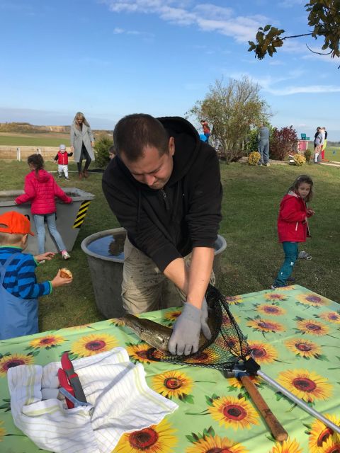 Kromě čerstvých ryb z výlovu (kapr samozřejmě smažený a s bramborovým salátem, zatímco štička a úhoř jen tak na kmíně) se účastníci mohli vrhnout do celého kotle guláše a nekonečného množství všech možných slaných i sladkých chuťovek, včetně celé bečky piva.