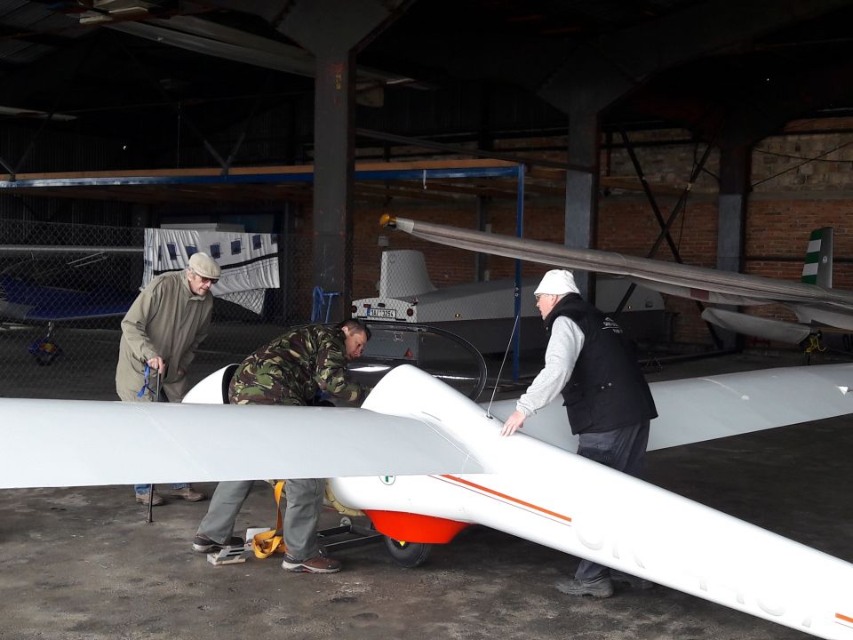 Zatímco VSO-10 prozatím čeká na opravu v servisu ve Vysokém Mýtě (hotová by měla být nejdřív v polovině dubna), L-33 už je po zimní pauze znovu složená v hangáru a připravená k akci. ASK-21 sice vypadá bez křídel trochu v nedbalkách, ale k finálnímu zprovoznění už vlastně chybí jen vyměnit jeden z mikrofonů. Vlečná Z-142 se v pátek vrátila z kontroly v leteckém servisu v Plasích. A do své původní garáže se z dílny po generální opravě přestěhoval zpět i naviják.