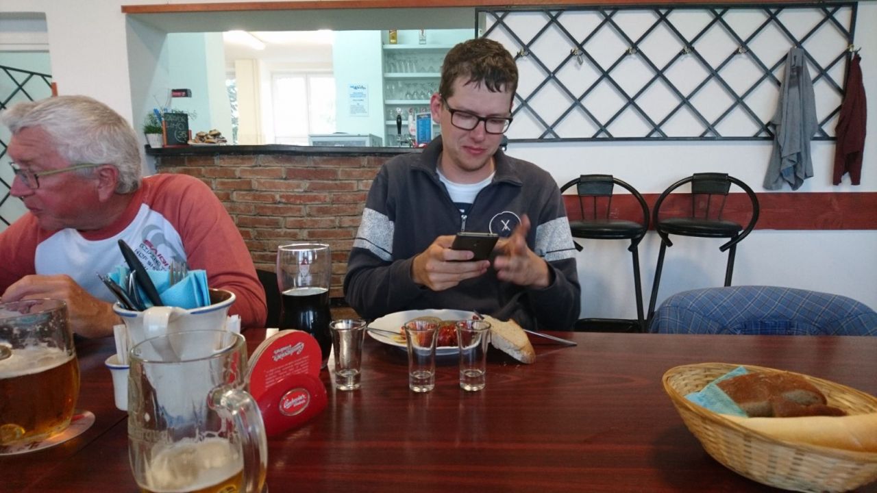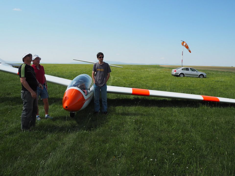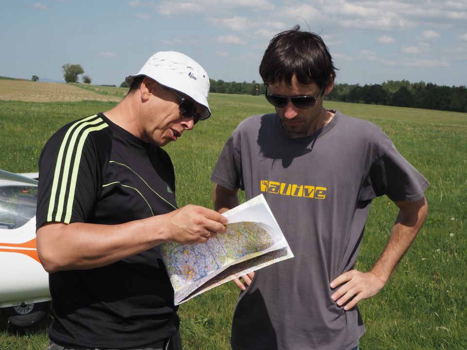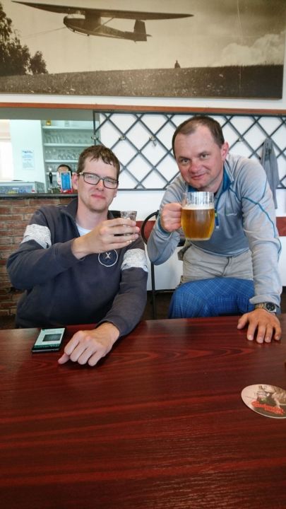 Tedy, až na výkonový tandem Cirrus (Víťa Polok) a VSO-10 (Pavel Kuriščák) samozřejmě. Kluci nadeklarovali dvěstepadesátkový trojúhelník Kácov – Stará Říše – Hosín, a když nám nad Budějovicemi vypli termiku, nacházeli se někde v poslední třetině prvního ramene. Nám už pak nezbylo než jim na dálku držet palce, když o půl třetí otáčeli Kácov a o půl páté Starou Říši, a pak na palcích přitlačit ještě o něco víc, když se na Moravě objevily bouřky, které se jim hnaly v patách až do samého závěru. Jakmile pak o půl šesté šťastně dosedli na hosínskou ranvej, bylo jasné, že tenhle životní výkon se neobejde bez mimořádné oslavy.