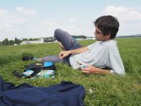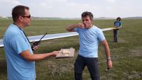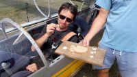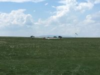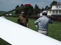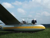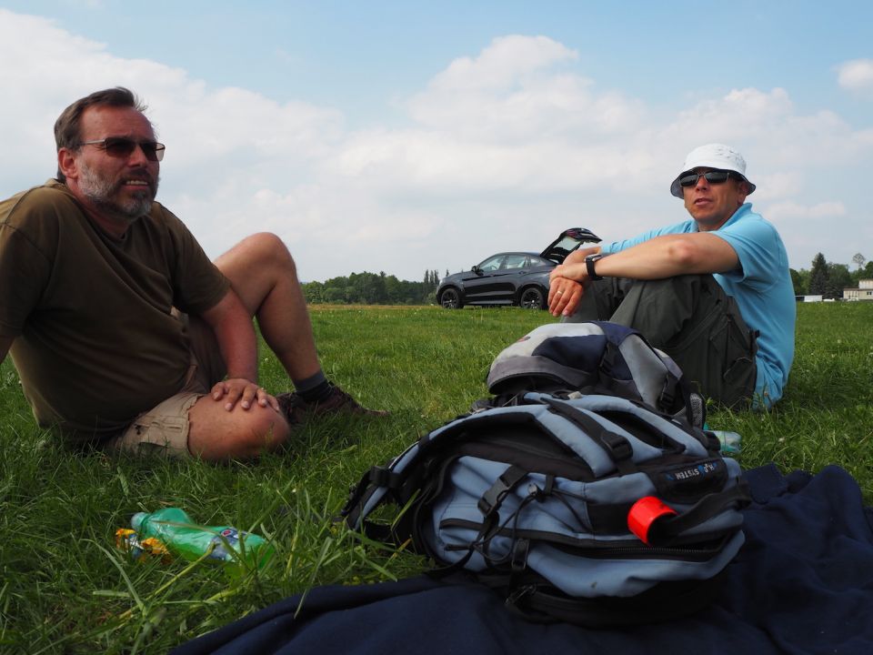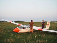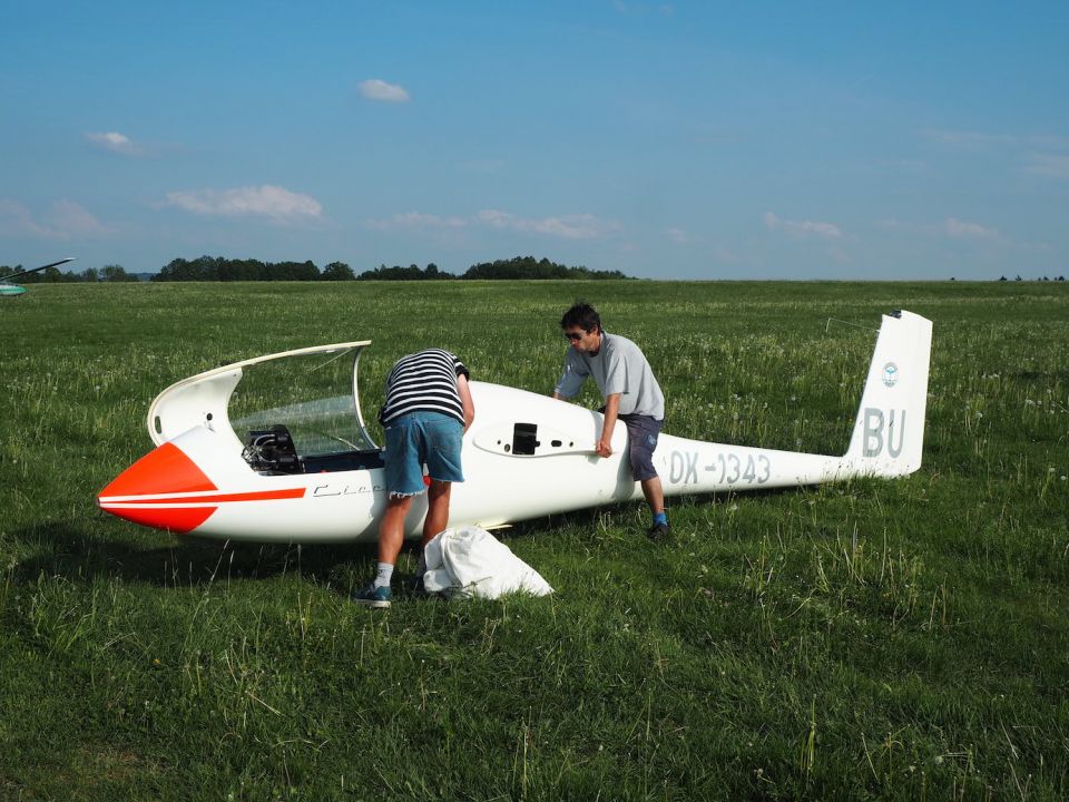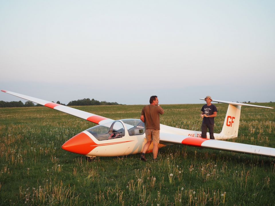 O půl čtvrté přestává termika fungovat i Pavlovi, který se ale v blízkosti žádného letiště nenachází a musí tedy svoji VSO-10 posadit na pole blízko Podolského mostu a zaznamenává tak první (a jediné!) pole letošního jarního soustředění. Terén byl sice trochu vlnitější, než Pavel původně předpokládal, takže si s Vosou kapku “zalyžoval” z kopce, ale ani jemu, ani letadlu, ani louce se nic nestalo. Na pomoc tentokrát vyráží pozemní podpůrný tým ve složení Petr Novotný a Víťa Polok, kteří berou kromě auta s vlekem ještě druhý vůz: situace totiž plánujeme využít a větroň, který už je vlastně skoro na půl cestě na domovské letiště, poslat ve vleku i s Pavlem rovnou zpátky do Bubovic.