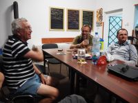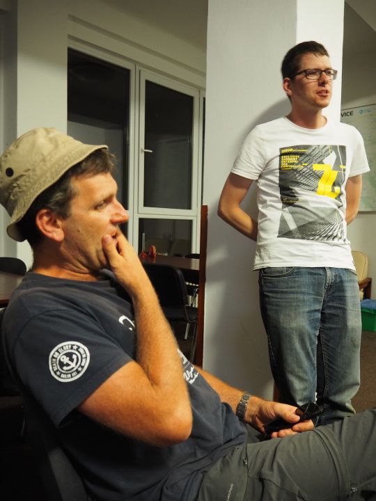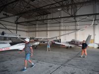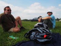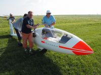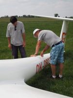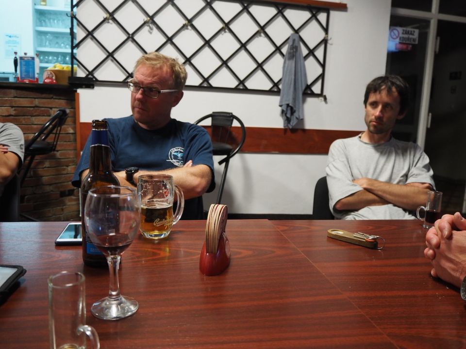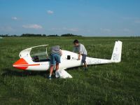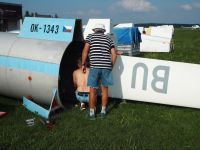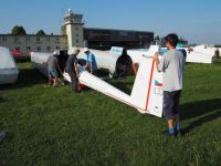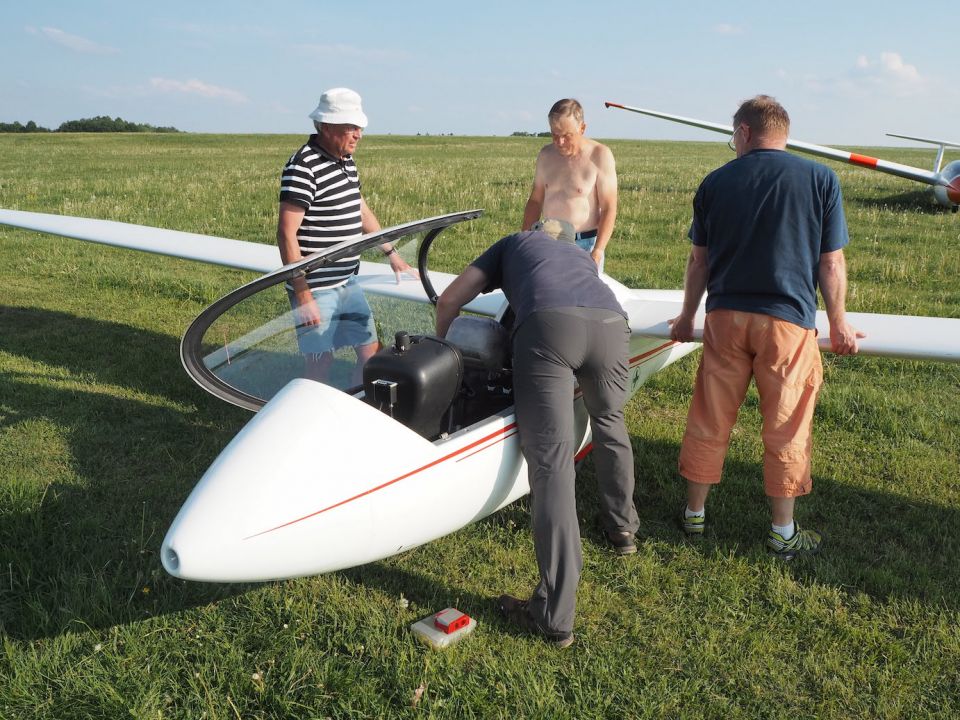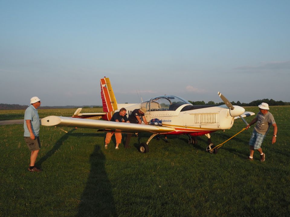 V Hosíně zatím ukončujeme provoz, skládání hangáru odkládáme (dnes večer tam budeme ukládat jen dva Blaníky a vlečnou, to bychom měli mít raz dva) a rovnou se pouštíme do rozborky ostatních letadel do vleků, abychom zítra mohli trasporťáky jen připřáhnout a vyrazit k domovu. Tou dobou už mohou přiložit ruku k dílu i Petr s Víťou, kteří se už vrátili ze záchranné akce od Podolského mostu. Když se západem slunce zamkneme poslední vlek a vyčerpaně usedneme k večeři, přijdou se nás rakouští plachtaři zeptat, zda mohou své Discusy-2c uklidit do hangáru dozadu a my si pak naše Blaníky jen přistrčíme dopředu – což vyhodnotíme jako výborný nápad a souhlasíme. Místní VLP se chvíli snaží Rakušákům při skládání hangáru pomoct, ale po chvíli neúspěšného poposouvání, šťouchání a opětovného vyndavání se všichni se společným usnesením, že “die Kollegen aus Bubowitz haben System”, rozhodnou přenechat hangár odborníkům, takže nás po večeři čeká ještě všemi oblíbená hangárová rozcvička. Večer pak ve zdejším baru vyhodnocujeme dosažné výkony, abychom vyčkali na Pavla, který se z Bubovic vrací do Hosína až kolem jedenácté večerní. Přijíždí – nevíme přesně proč – s poznatkem, že “v Bubovicích máme stejně to nejútulnější letiště na světě”.