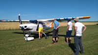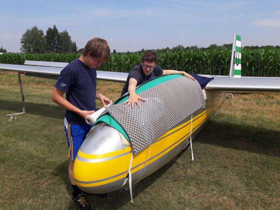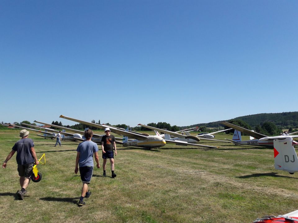 První soutěžní den připadá na neděli 30.6.2019, grid je na dráze otevřen od 8:30, ale - a to je trošku překvapení - tou dobou už má většina natěšených posádek letadla na dráze, nebo jsou připravena na pojezdových plochách, jen je na dráhu šoupnout. Pavel s Honzou a Peťulínem tedy prvně připravují Blaník ke startu, jen aby se o půldruhé hodiny později na brífingu dozvěděli, že meteorologická situace je nejistá, a po opakovaném odkládání startu mohli Blaník ve tři odpoledne zase vrátit z gridu zpátky na kotvy. Pondělí je už ráno rovnou prohlášeno za neletové. Meteorolog ale při ranním brífingu varuje před výskytem bouřek se silnými větrnými poryvy a dokonce s kroupami, na pondělní dopoledne je tedy o zábavu postaráno: důkladné upevňování Blaníku na kotvách a jeho pečlivé obalení veškerými měkkými materiály, které se bubovickému týmu povede dát dohromady. Kroupy nakonec skutečně padají, naštěstí ale jen malé a důkladně zaizolovaný Blaník je přečká bez poskvrnky.