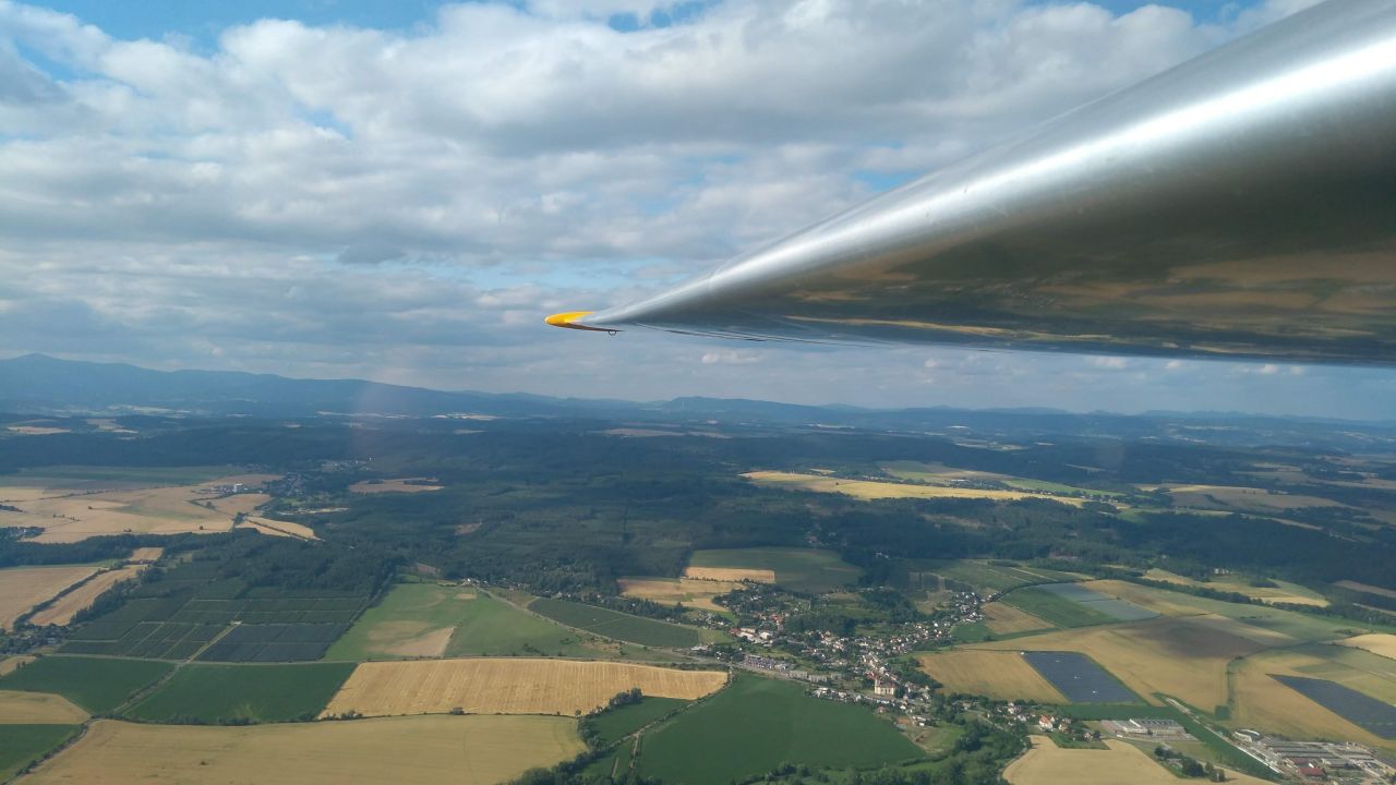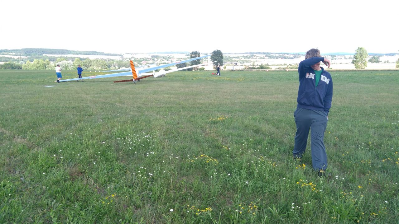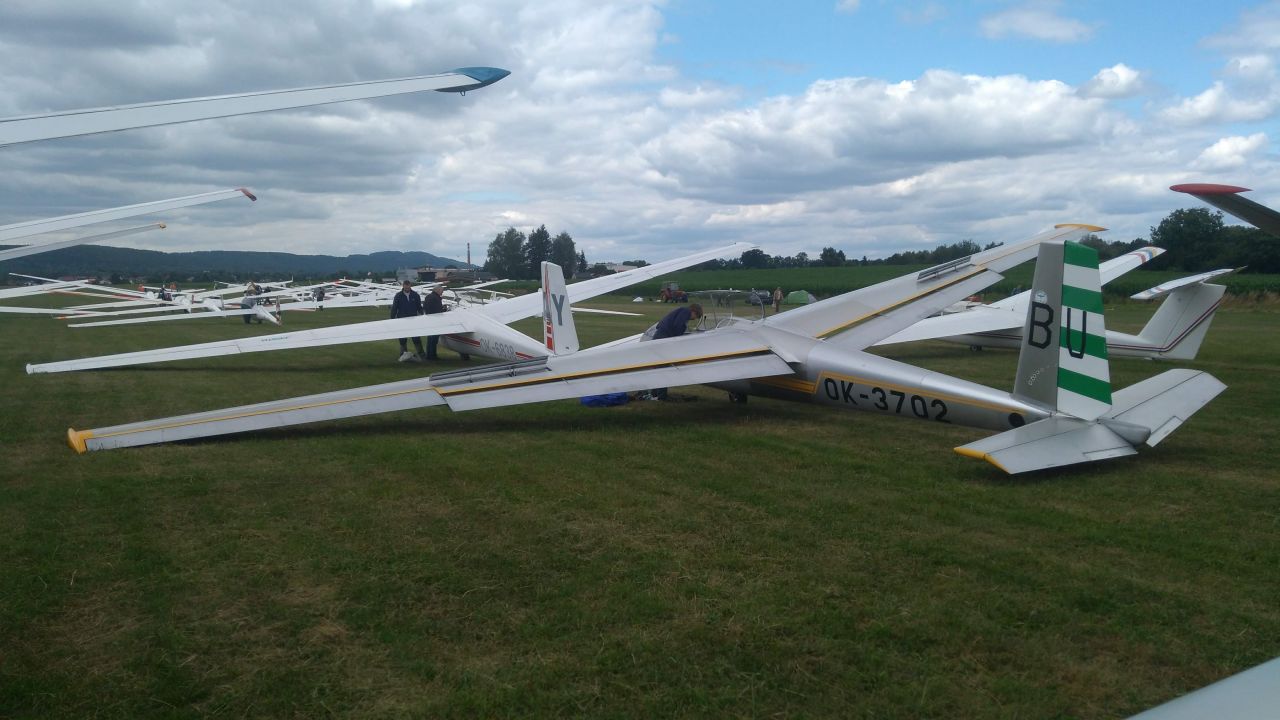 I přes původně chmurné počasí nás organizátoři stříli krátce po poledni do vzduchu. Pro Peťulína je to konečně první závodní start! V první půli se nám leti moc dobře, vyprovokování chumlem ostatních závodníků letíme v AAT úloze daleko. Při návratu na druhý otočný bod už to skoro vypadá, že budeme muset přistát zpátky ve Dvoře, ale stoupák se nakonec dostavuje. Nemohli jsme samozřejmě tušit, že to byl taky ten poslední, co jsme dnes potkali! Vynuceně tak přistáváme v Novém Městě spolu s dalšími dvěma blaníky.