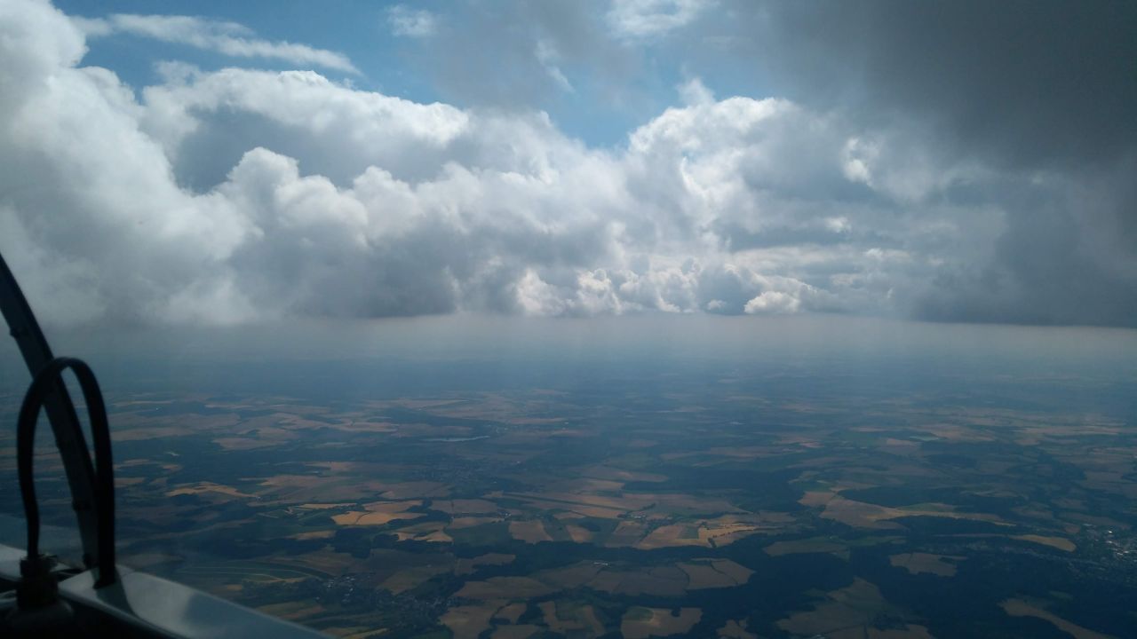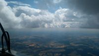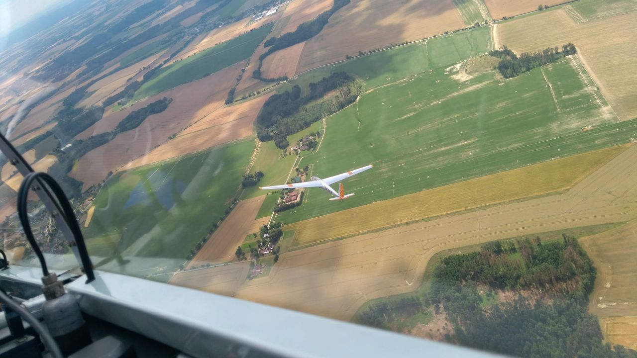 Potom se počasí začalo zlepšovat, mluvčí závodů na webu začal do aktualit psát dokonce obraty jako “malá austrálie” a podobné superlativy. To se ale asi nějak nevypropagovalo do míst, kde jsme byli my. Po neustálém krachování kolem desátého kilometru od letiště jsme konečně vytočili první lepší stoupák, abychom hrdinně nasadili na trať a ještě hrdinněji po pár minutách roztočili kolo o ULL plochu Třebihošť, kousek od Zvičiny. Dost nám pomohlo, že jsme zmíněnou plochu výletnicky navštivili s Peťulínem před pár dny, protože ze vzduchu není moc poznat, že se tam dá přistávat jen z jihu, že je kolem plochy elektrický ohradník a že ta cesta co vede přímo napříč se dá normálně přejet :) Krátce po nás si k nám přisedli kamarádi z Kolína v FL.