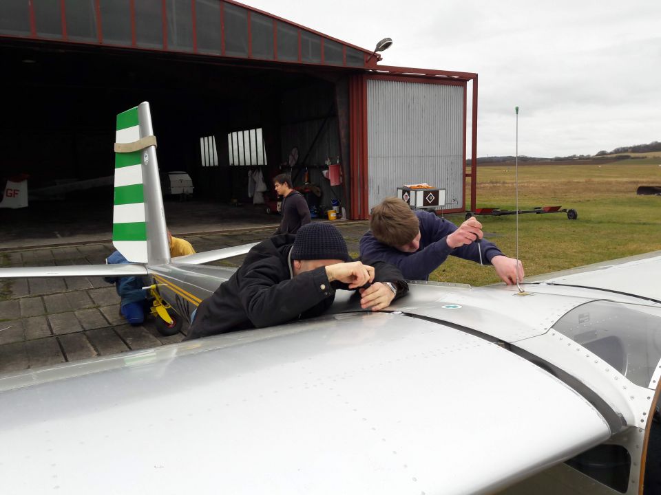 Současně probíhá také zimní údržba veškeré techniky. Sobotní počasí nám přálo, takže bylo možné montáž provádět i pod širým nebem. Improvizovaná dílna v hale pak umožňuje pracovat na letadlovém parku i v případě méně příznivých povětrnostních podmínek.