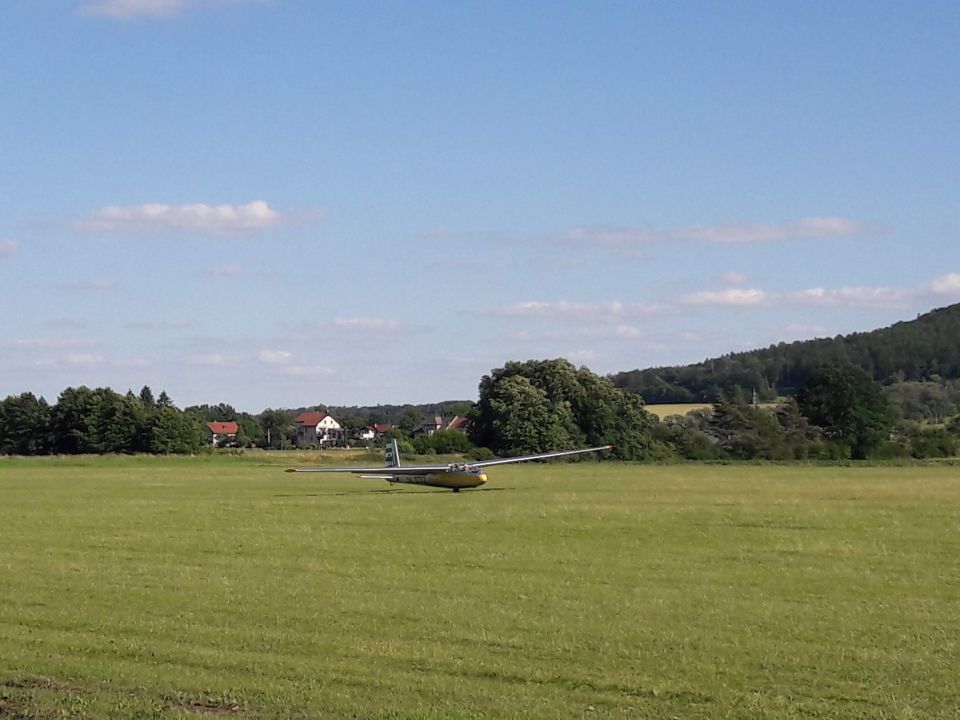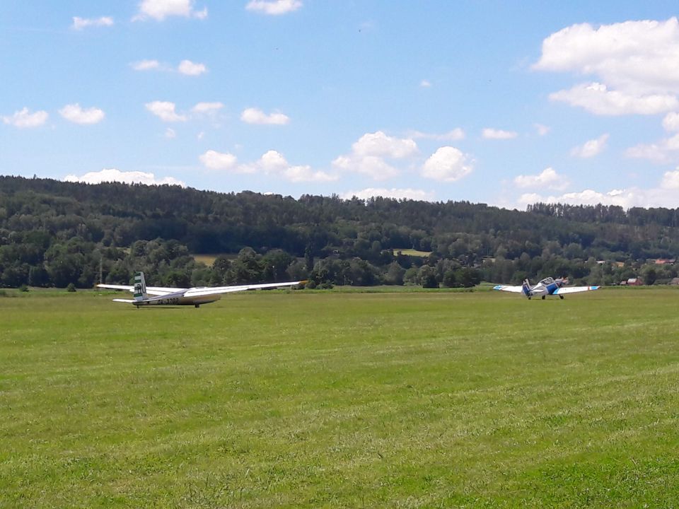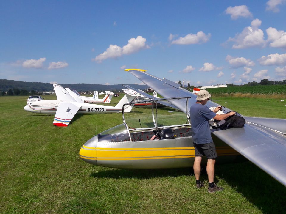 V neděli ráno se v přehledu výsledků dozvídáme, že byla s definitivní platností zrušena páteční AAT disciplína (kromě našich borců ji totiž uletěli jen manželé Příhodovi, a dvě úspěšné posádky na platnou disciplínu nestačí). Včerejší přelet je tak pro Blaníky jedinou platnou disciplínou a my s napětím očekáváme, zda se nám v příštích týdnech podaří uskutečnit ještě alespoň dvě další, aby byly vůbec platné celé závody. Dnešek tomu ale příliš příznivě nakloněn není. Ráno ani nestavíme letadla na grid a pro informace si přijdeme až na briefing v deset hodin. Slovo meteorologa, který vždy srší optimismem: “Starty dnes budou možné! Ale to je tedy asi tak všechno…” Bez vyhlídky na termické počasí je neděle prohlášena za neletový den, čehož využíváme na výlet do Hronova za Milošem Matějkou, který si tu na týden udělal plachtařskou dovolenou. Podnikneme s ním asi dvacetikilometrový pěší výlet po česko-polském pomezí (jen je trošku škoda, že jím vychvalovanou pstruhovou restauraci nakonec najdeme v ruinách a túru tak jdeme hlady).