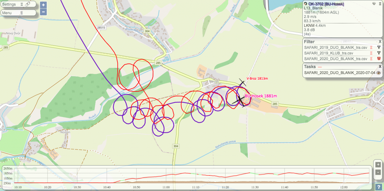K veliteli letounu OK-3702 Petru Hoškovi, který za kniplem pokračuje i ve druhém týdnu závodů, se po odjezdu kopilota Pavla Kuriščáka připojuje Honza Liška. Situace je pro bubovický tým příznivá, protože po včerejší AAT disciplíně, ve které Peťulín s Pavlem zazářili, stojí na průběžném prvním místě. Příznivé je také počasí, meteorolog Mirek Šmíd nás na ranním briefingu přímo navnadí: interval by měl vydržet minimálně do 17 hodin, výšky základen kolem 2000 m, průměrná rychlost stoupání se předpokládá 2,5 m/s. Tomu odpovídá i ambiciózní trať - pro Blaníky je připraven polygon Kocbeře - Rudník - Pastviny - Úpice, celkem 176,49 km. Původně zamýšlený start v 11:15 je sice o půl hodiny odložen, ale před dvanáctou už se skutečně startuje a ve 13:06 je otevřena páska. Západní vítr pracuje v úvodních segmentech pro nás, Peťulín s Honzou kolem třetí odpolední úspěšně otáčejí hráz přehrady Pastviny, čeká je ale těžší část trati, kdy se musejí proti větru probojovat zpět k Úpici. Termické počasí navíc oproti předpovědi trochu slábne a hned několik pilotů končí v okolních polích. Ne tak náš letoun! Zdařilá pilotáž, dobrá intuice a také trocha nezbytného štěstí (v podobě strategicky umístěného kroužícího padáčkáře) nakonec naši posádku přivede o půl šesté večer po zdařilém přeletu zpět na letiště ve Dvoře - a AK Beroun se umisťuje jak v disciplíně, tak i průběžně na krásné bronzové příčce. Celou disciplínu dokončily kromě té naší jen dva další posádky, jednáse tedy o mimořádný úspěch - a ten mohou piloti hned zapít! Večer se totiž koná již tradiční vinná ochutnávka pod vedením sommeliéra Ondřeje Kuříka, a co nezvládla únava z pilotování, dokoná dvanáct vinných vzorků. Dlouhý a náročný den to byl.