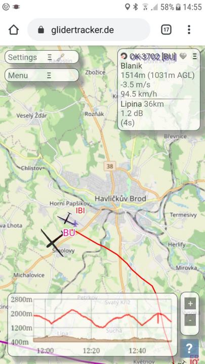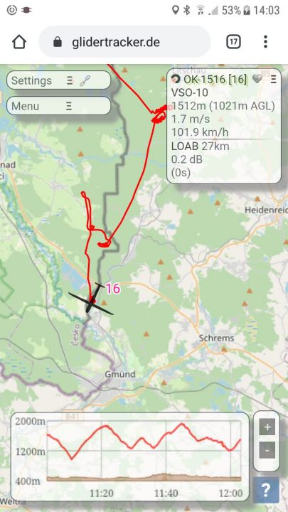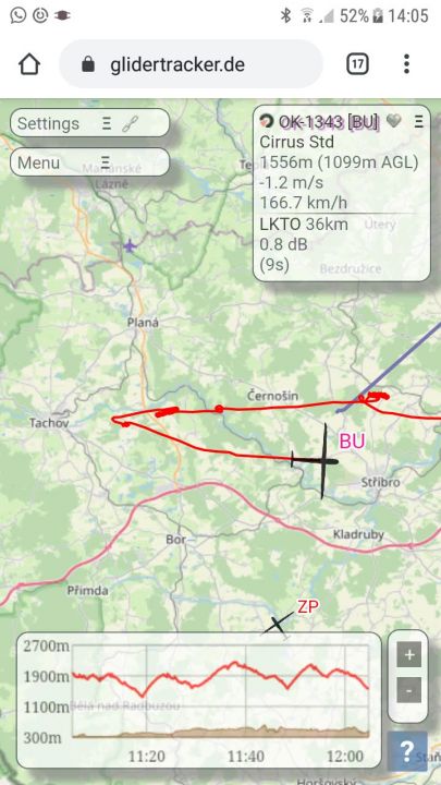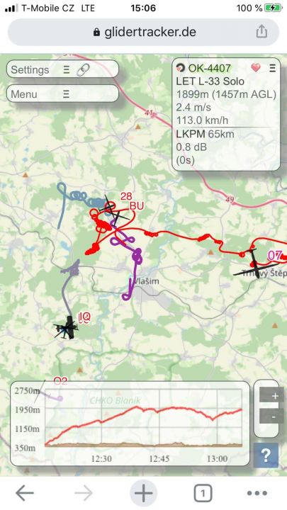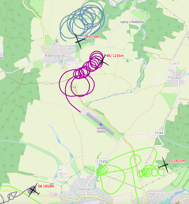 Sledujeme taky Peťulína, který pokračuje na trati do Českých Velenic. Je zřejmé, že na jihu republiky to má docela obtížné. Posádka Liška - Matějka dokonce upustila od otočňáku v Třeboni a otáčejí na východ k HavlBrodu. Peťulín se ale nevzdává nikdy, letí svoji třístovku, i když se podmínky jednoznačně zhoršují (o dvacet kiláků z Třeboně do Českých Velenic bojuje hodinu). To Mára to má na plachtařské dálnici na háku, Tachov má dávno za sebou a blíží se zpět k Vlašimi, aby se vypravil ještě na východ republiky, směrem ke Křižanovu.