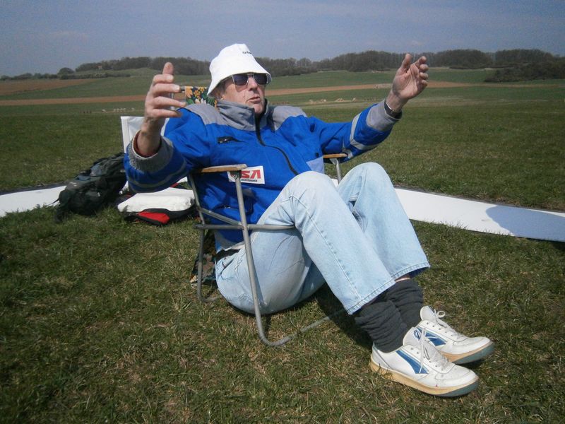 Zatímco Matěj učil alpské orly lítat, ostatní členové si na bubovickém letišti oživovali po zimní přestávce své pilotní návyky. Vše probíhalo celkem normálně, ale co čert nechtěl - přece jen se stala nehoda - naštěstí ještě na zemi a bez fatálních následků. Náš nejstarší člen, ak.arch. Tonda Kryl, pocítil na vlastní kůži (a tělo) důsledky zanedbané pravidelné roční prohlídky a opravy pozemní techniky. "Načnutý" potah skládací židle nevydržel nárůst hmotnosti získaný patrně v polední přestávce na oběd.