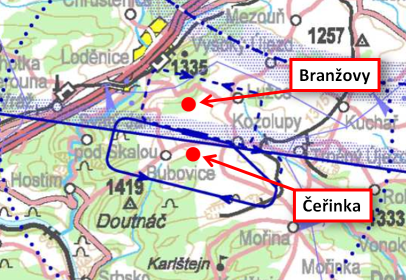 Lom Čeřinka se nachází v těsné blízkosti jižně letiště. Lom Branžovy severně. V době plánovaného odstřelu v lomech dbejte zvýšené opatrnosti a nelétéjte nad nimi.